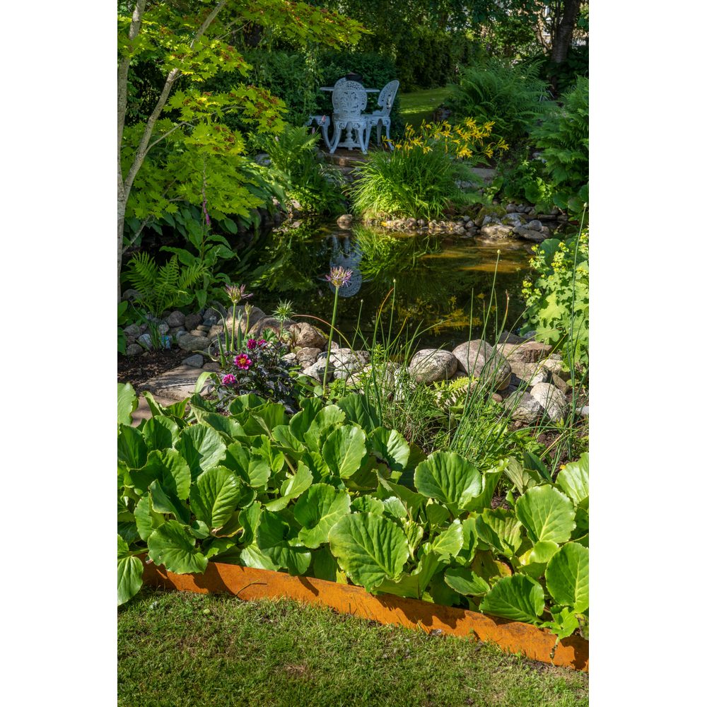 Lågt kantskydd för diskreta, tydliga avgränsningar längs rabatter, grusgångar och gräskanter. Delarna skjuts i varandra och placeras i marknivå. Obehandlat cortenstål som patinerar naturligt. 4×110 cm = 4,4 m.