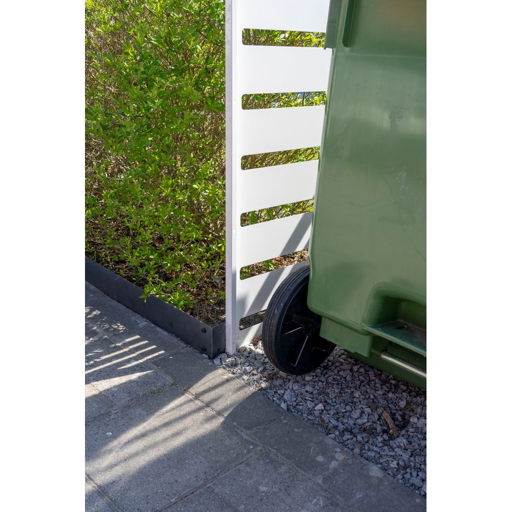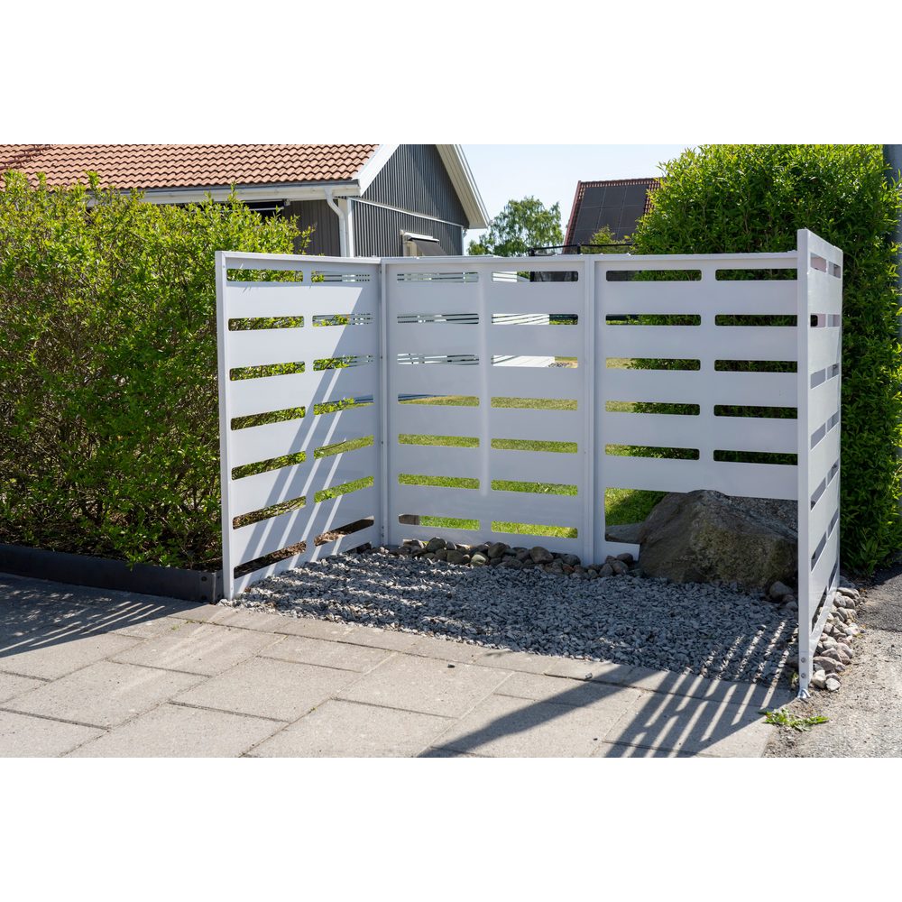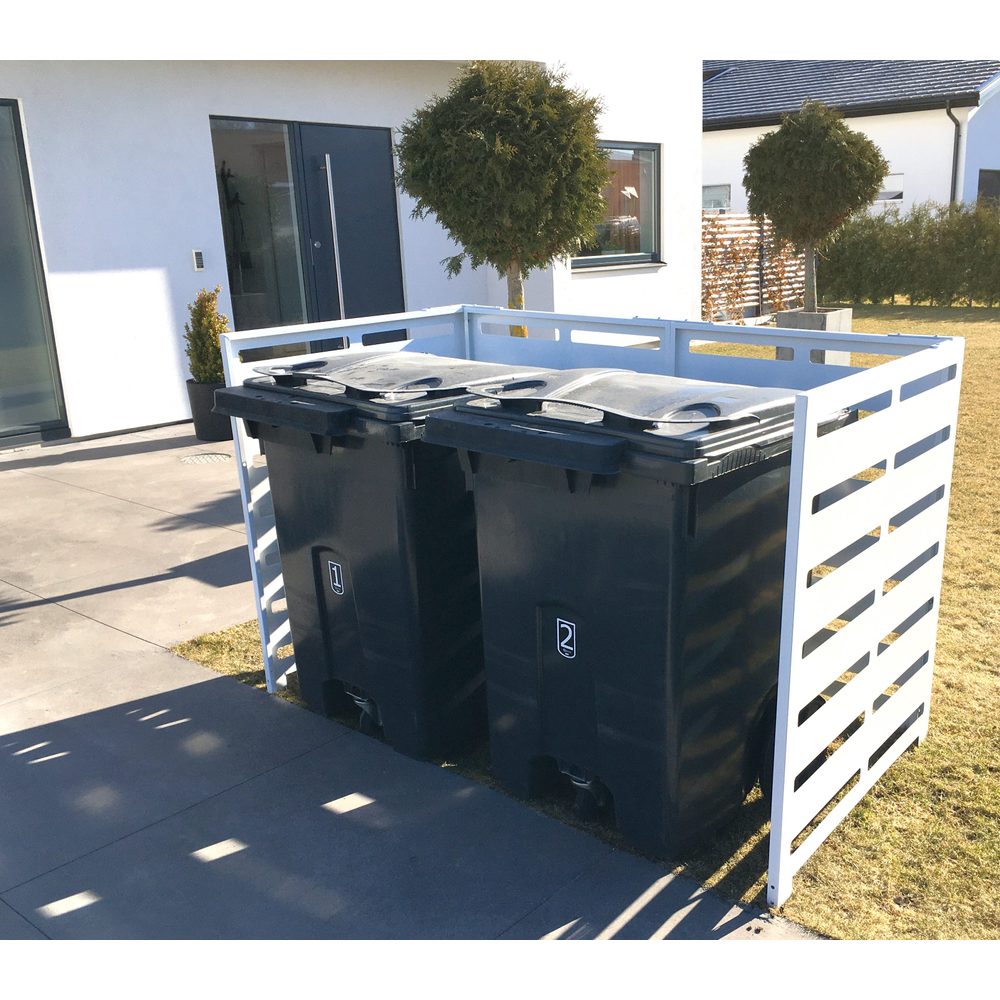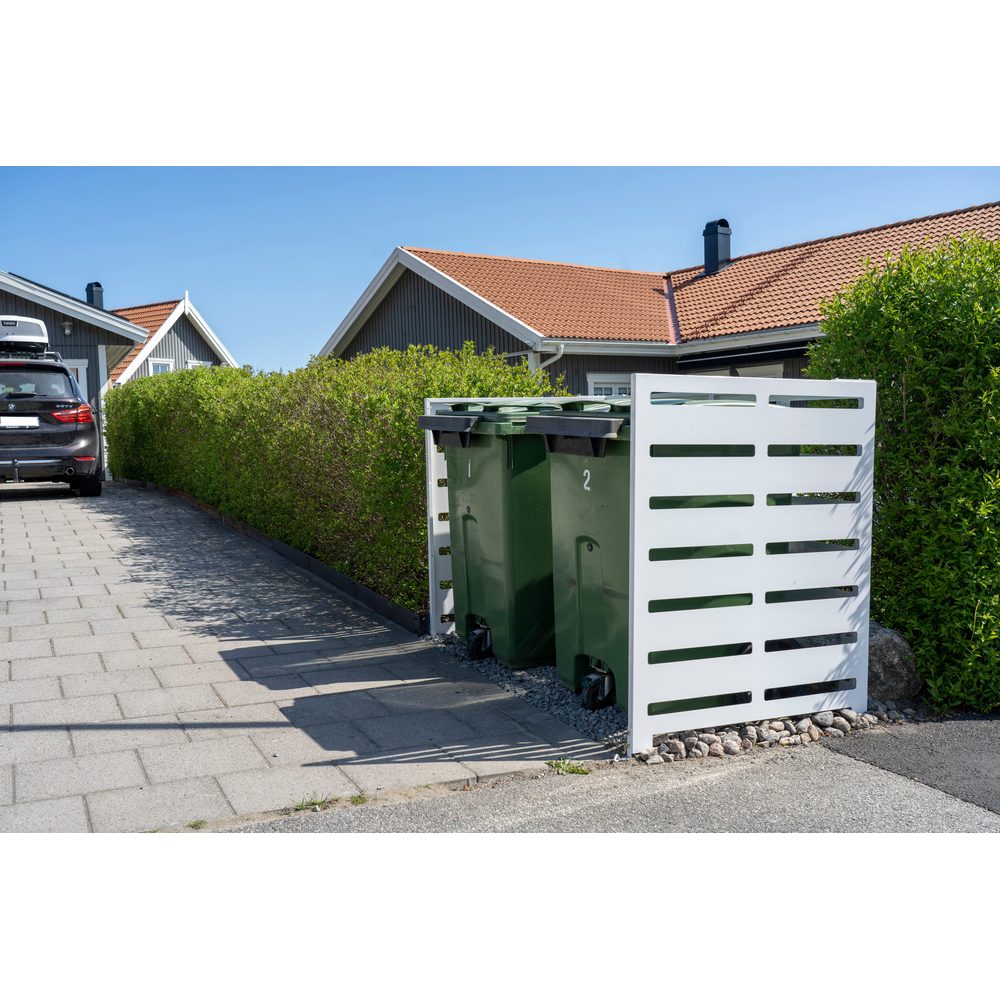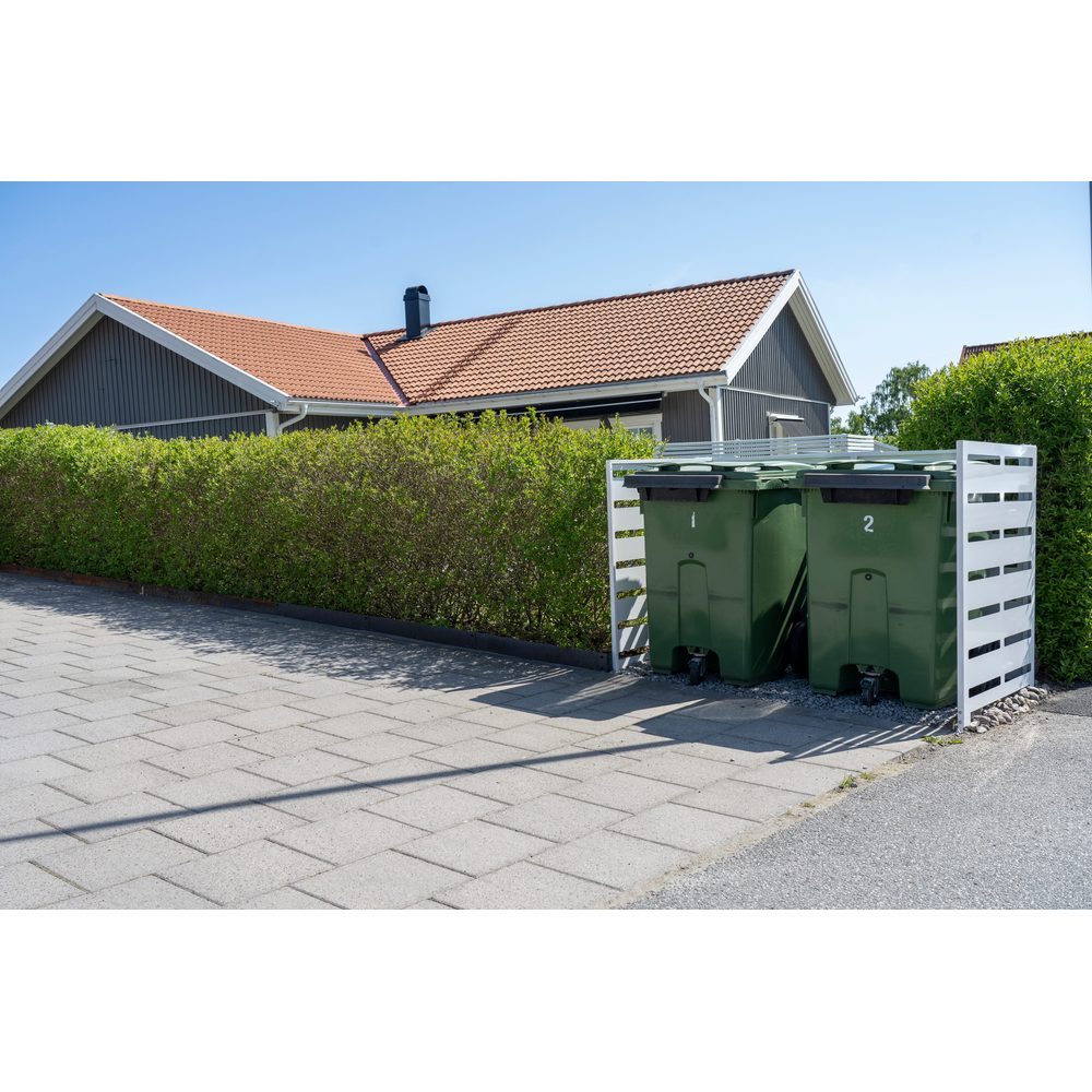Ett robust soptunneskydd som samlar två sopkärl på ett prydligt och väderskyddat sätt vid entré, garage eller uppfart. Kapslingen minskar insyn, håller området lättstädat och ger ett lugnt uttryck som harmonierar med ljusa fasader. Den ventilerade konstruktionen motverkar kondens och lukt utan att tumma på skyddet mot regn och snö.
