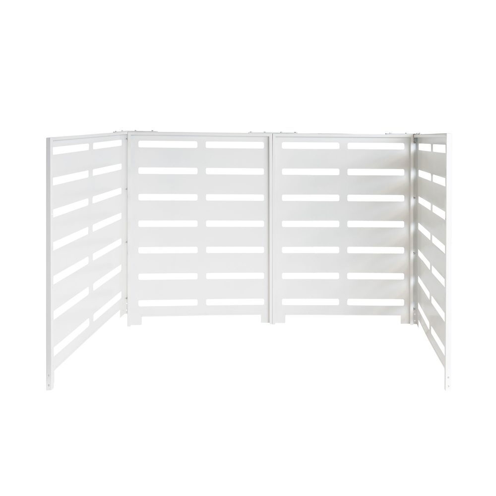 Tillverkat i galvaniserad stålplåt som är pulverlackerad i vitt – en tålig kombination för utomhusbruk som inte rostar och kräver minimalt underhåll. Invändiga mått: D 940 × B 1740 × H 1160 mm (djup × bredd × höjd), vilket ger gott om plats för två vanliga sopkärl inom dessa mått. Ytorna är lätta att rengöra och håller sin finish över tid.